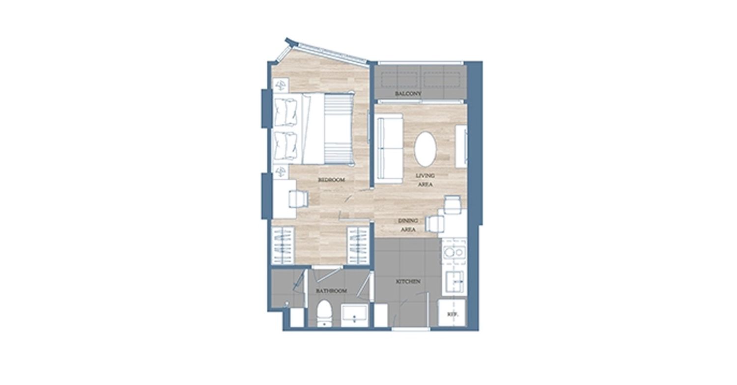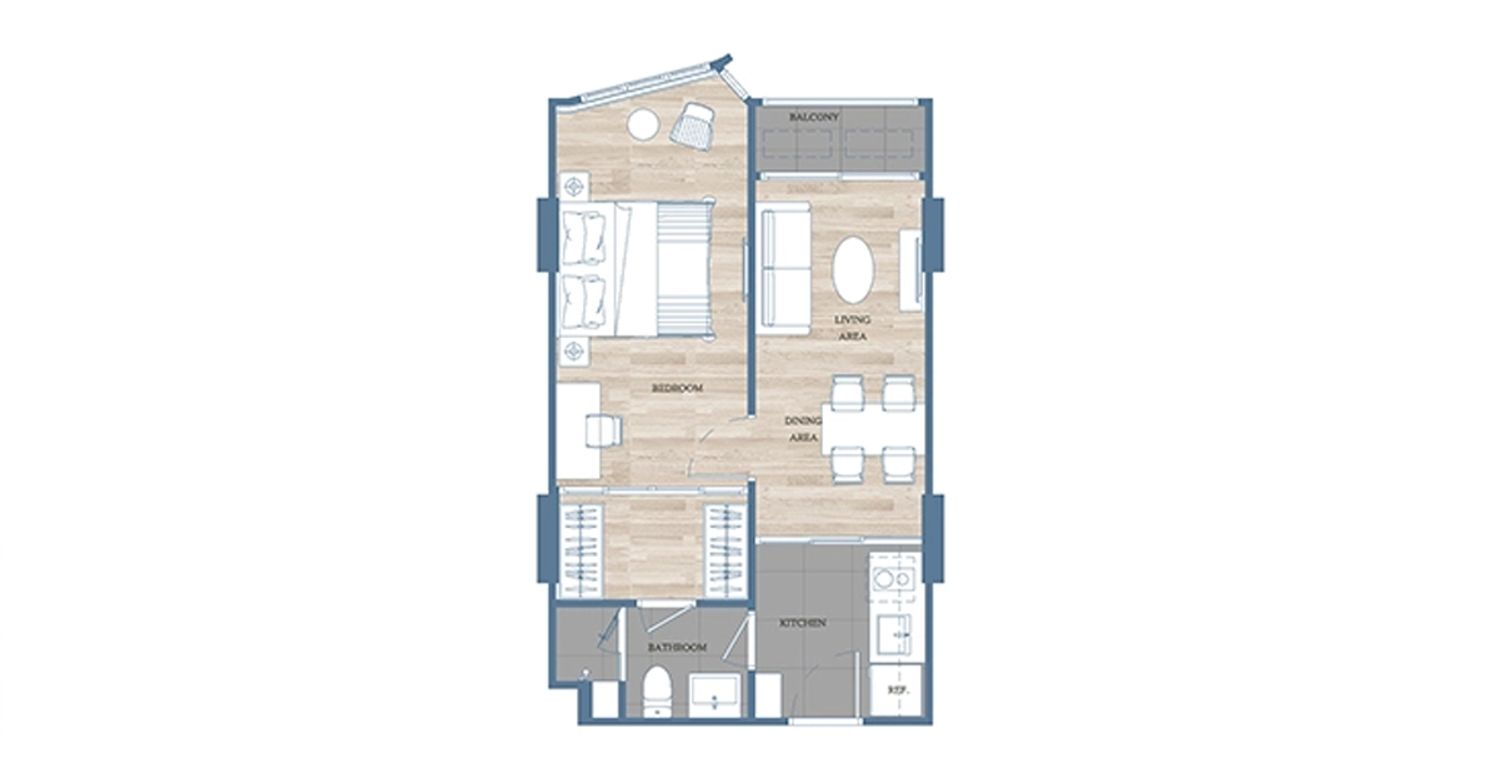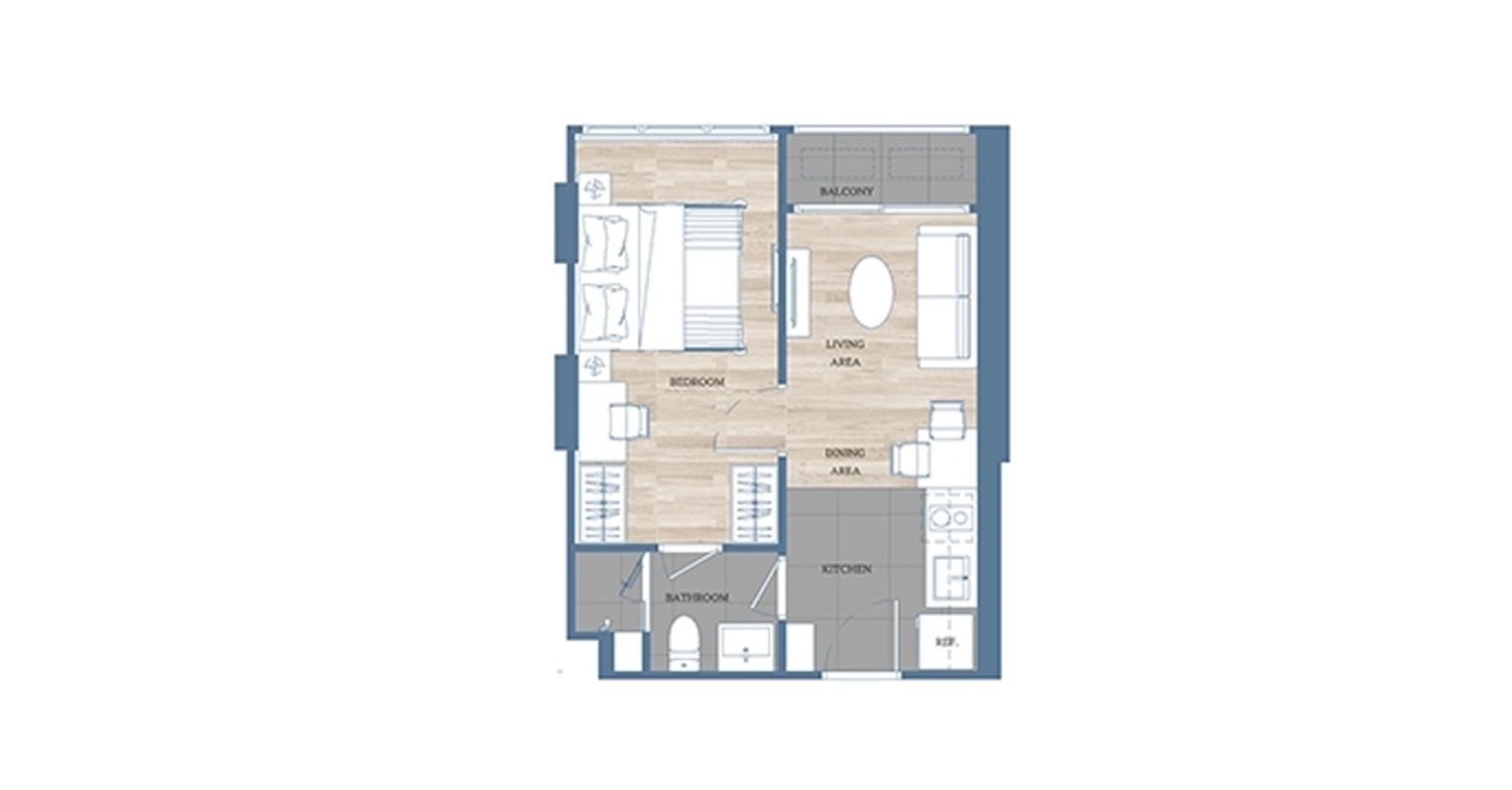 * 1 ห้องนอน 1 ห้องน้ำ พื้นที่ใช้สอย 34.75 – 43.75 ตร.ม.