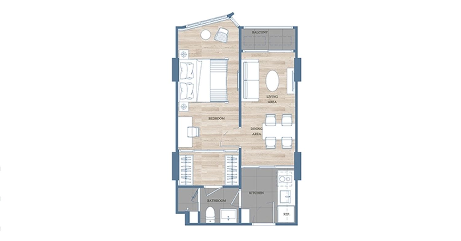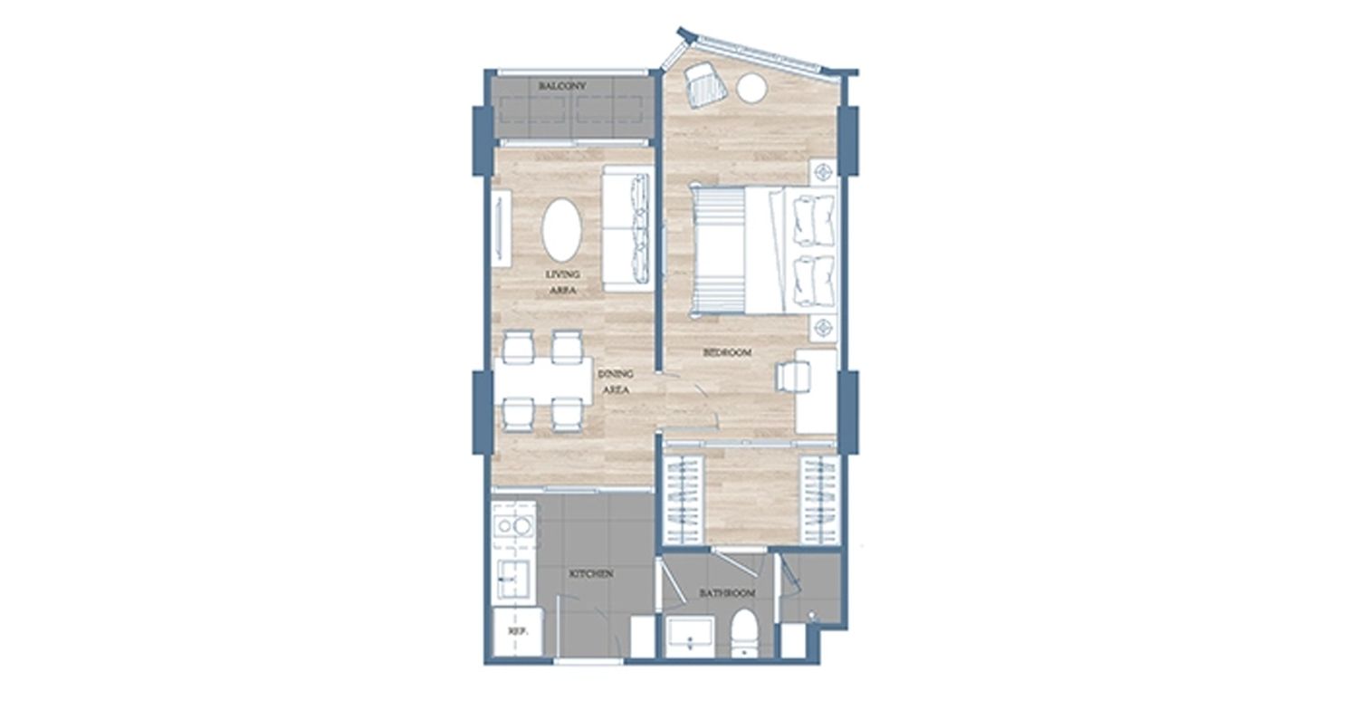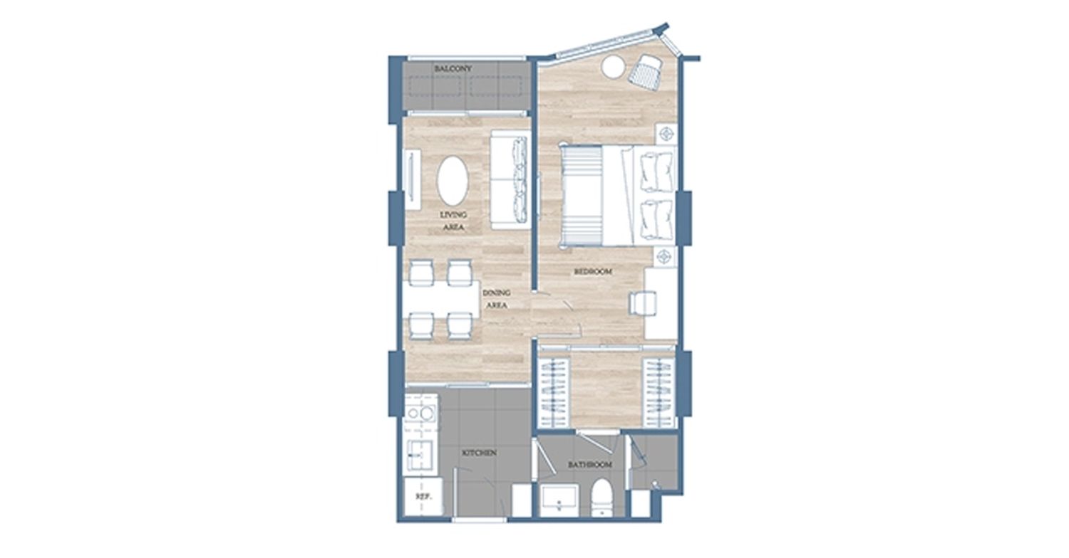 * 1 ห้องนอน 1 ห้องน้ำ พื้นที่ใช้สอย 34.75 – 43.75 ตร.ม.