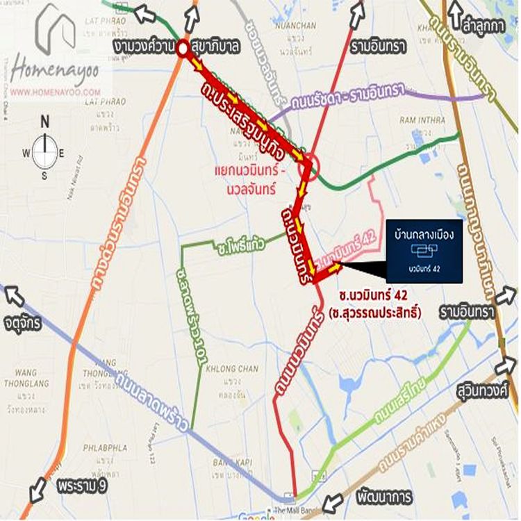 การเดินทาง เริ่มจาก ถ.ประเสริฐมนูกิจ (ถ.เกษตร-นวมินทร์) ⇒ ถ.นวมินทร์ ⇒ ซ.นวมินทร์ 42 หรือ ซ.สุวรรณประสิทธิ์ ขับตรงไป 500 ม.ถึงโครงการ บ้านกลางเมือง นวมินทร์ 42 *ลัดเข้า-ออก ซ.ประเสริฐมนูกิจ 48 อีกทางได้ค่ะ