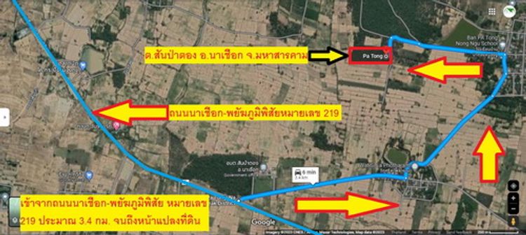 สถานที่ใกล้เคียง / Nearby Places 1. โรงเรียนบ้านป่าตองหนองงู 950 เมตร 1. Ban Patong Nong Ngu School 950 meters 2. องค์การบริหารส่วนตำบลสันป่าตอง 3.3 กม. 2. San Pa Tong Subdistrict Administrative Organization 3.3 km. 3.ตลาดนัดโค-กระบือหนองกุง 5 กม. 3. Nong Kung Ko-Buffalo Market 5 km. 4.ที่ว่าการอำเภอยางสีสุราช 9.1 กม. 4. Yang Si Surat District Office 9.1 km. 5.โรงพยาบาลนาเชือก 14 กม. 5. Na Chueak Hospital 14 km. 6.ทางเข้าทรัพย์ติดถนนลูกรัง (ถนนกว้าง 5 เมตร) ห่างถนนลาดยาง 700 เมตร 6. The entrance to the property is on a dirt road (5 meters wide road), 700 meters from the asphalt road. 7. ห่างจากถนนนาเชือก-พยัฆภูมิพิสัย (หมายเลข 219) 3.3 กม. 7. away from Na Chueak-Phayakhaphum Phisai Road (No. 219) 3.3 km. 8. ห่างจากตัวอำเภอนาเชือก 14.9 กม. และ ห่างจาก ตัวจังหวัดมหาสารคาม 72 กม. 8. away from Na Chueak District 14.9 km. away from Maha Sarakham Province 72 km. 9. ที่ดินเสมอถนน 9. Land equal road