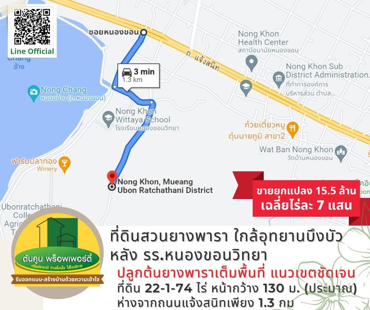 ขายที่ดินสวนยางพารา 22-1-74 ไร่ หลัง รร.หนองขอนวิทยา ใกล้อุทยานบึงบัว หนองช้าง เมืองอุบล