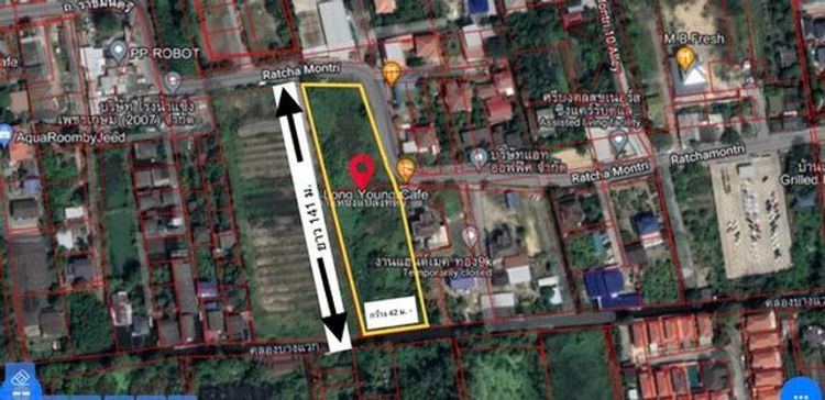 เนื้อที่ 3-3-93 ไร่ ติดถนนทางเข้า 6 เมตร ลึก 142 เมตร ด้านในกว้าง 42 เมตร