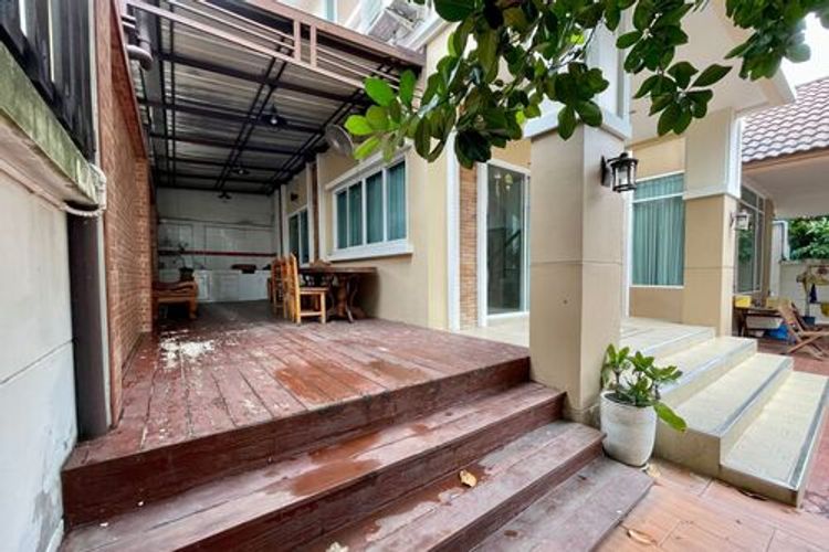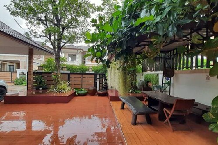 – หน้าบ้านปูกระเบื้องและระแนงไม้ สะอาด เหมาะกับการทำกิจกรรมยามเย็น