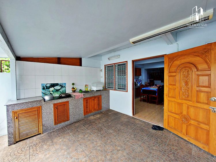 หลังบ้านปูพื้นกระเบื้องพร้อมห้องครัวเปิดโล่ง open air