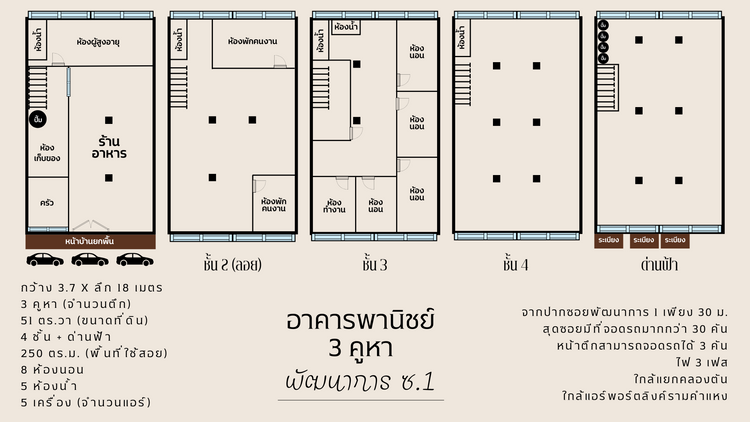- กว้าง 3.7 X ลึก 18 เมตร (ต่อตึก)