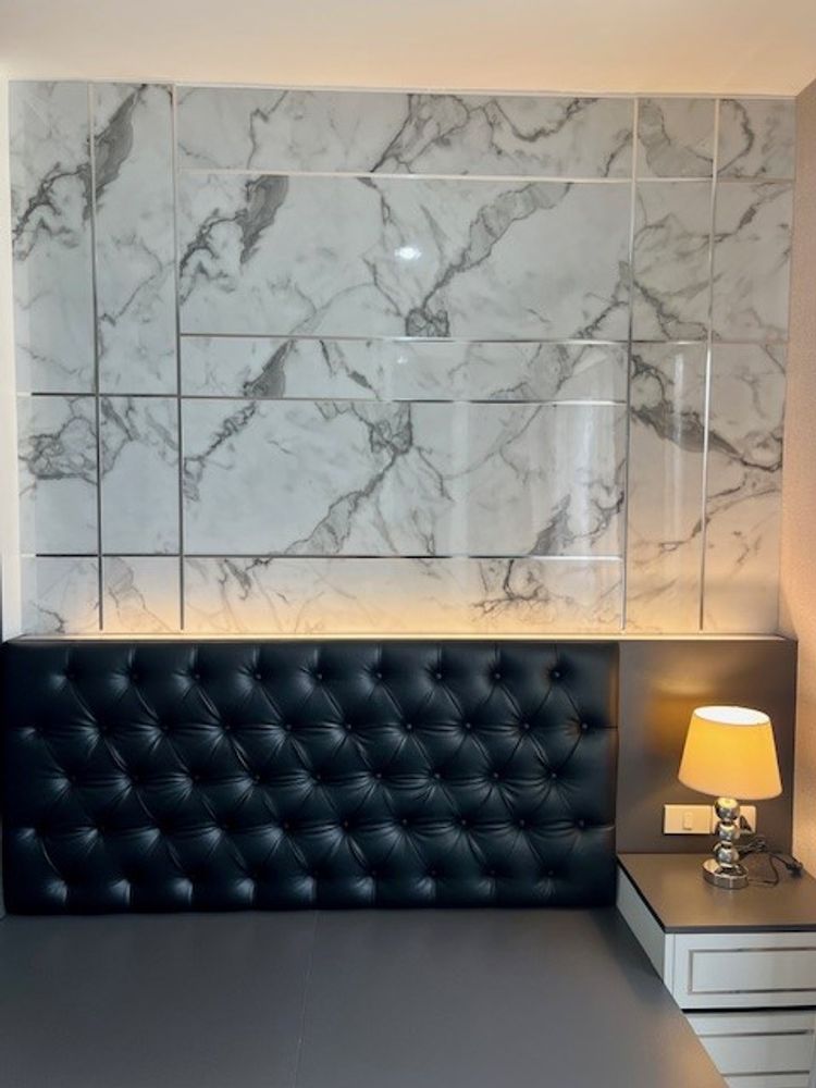 คุมโทนห้องด้วยสีเทา ตัดกับเตียงนอนบิ้วสีดำเรียบหรู Built in ลายหินอ่อนปนขาว คุมโทนสีได้อย่างลงตัว เพิ่มความหรูหราด้วยโคมไฟสีทอง สะท้อนกับผนังโต๊ะกินข้าว Built in กระจกอะคริลิค เพิ่มความมีเสน่ห์ชวนน่าหลงไหล แฝงความร้อนแรงแบบสุขุมนุ่มลึก #พร้อมให้คุณหิ้วกระเป๋าเข้าอยู่