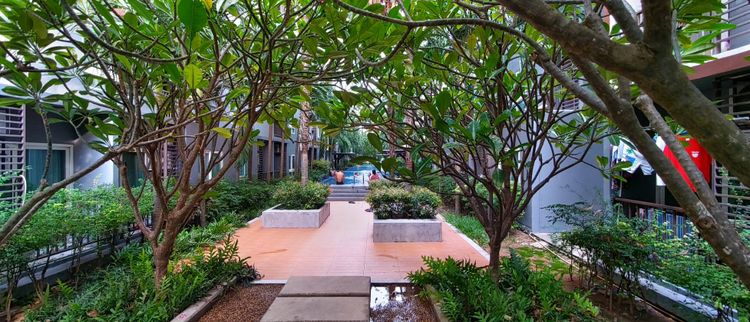 วิวสวนและสระว่ายน้ำ ส่วนกลางมีฟิตเนส ด้านหน้ามี 7/11 ร้านซักอบผ้าหยอดเหรียญ คอนโดห่างถนนสุขุมวิท 500 ม.