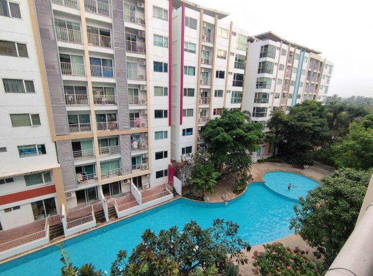 -สระว่ายน้ำขนาดใหญ่ อยู่หน้าตึก เดินลงไปสบายมากค่ะ ข้างสระมีเก้าอี้พักผ่อน ต้นไม้ร่มรื่น ตู้กดน้ำ ตู้เต่าบิน