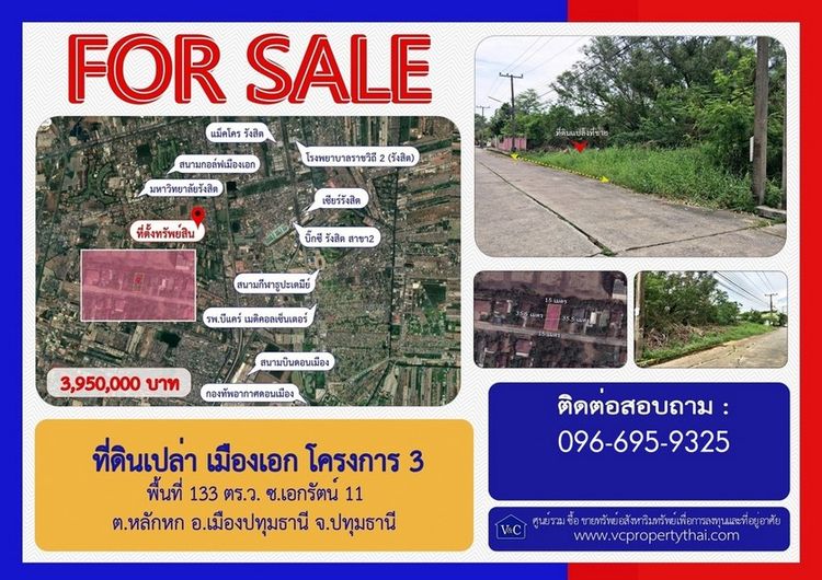 ขาย ที่ดินเปล่า เนื้อที่ 133 ตร.ว. ม.เมืองเอก โครงการ 3 ปทุมธานี