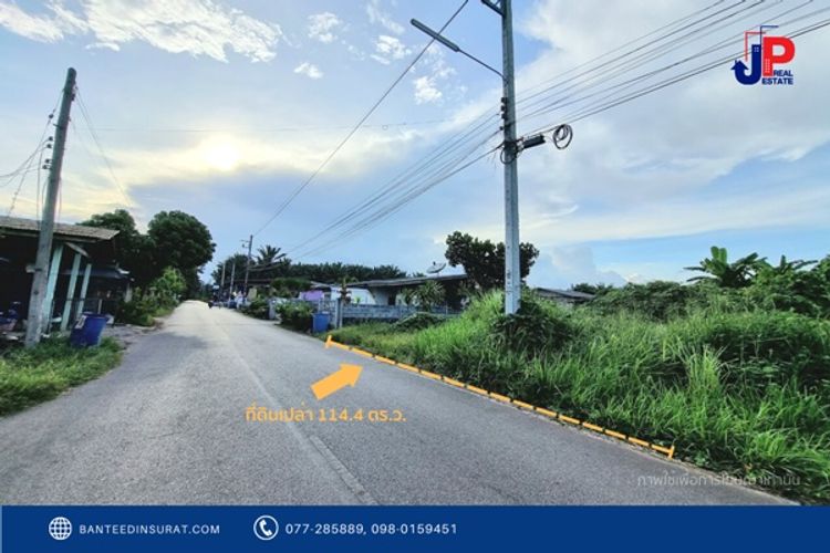 ขาย ที่ดินเปล่า 114.4 ตร.ว. หน้ากว้าง 20 เมตร ลึก 22 เมตร ซ.น้ำทรัพย์ ต.ขุนทะเล สุราษฎร์ธานี ติดถนนลาดยาง ราคาหลักแสน ใกล้บึงขุนทะเล 6 นาที