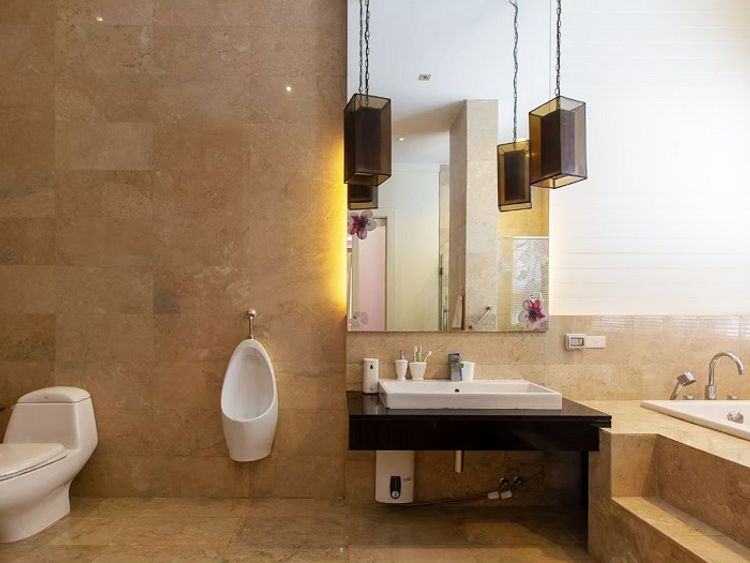 >> ขนาดใหญ่ 6*7 เมตร ตกแต่งสไตล์บาหลี มีห้องน้ำในตัว ห้องน้ำด้านขวาเป็นสไตล์ out door ติดตั้งอ่างจากุซซี่ ด้านซ้ายเป็นห้องน้ำ แบ่งโซนแห้ง,เปียก กั้นด้วยประตูกระจก เคาน์เตอร์อ่างล้างหน้าหินอ่อนเกร็ดทอง 2 ฝั่ง