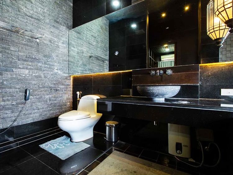 >> เหมาะสำหรับคนชอบเล่นน้ำ ผนังหินทราย พื้นหินธรรมชาติ เคาน์เตอร์อ่างล้างหน้าอาฟท์ดำ