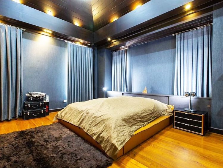 >> ห้องขนาดใหญ่ บิวท์อินแผงติดตั้งหลังทีวีหินอ่อน ปูพื้นไม้สักจริง บิวท์อินตู้เก็บของไม้สักแท้ สามารถเก็บของได้เยอะ เพดานสูง ติดตั้งโคมไฟชานเดอเลียร์สวยงาม ติดวอลเปเปอร์สานเกรดA