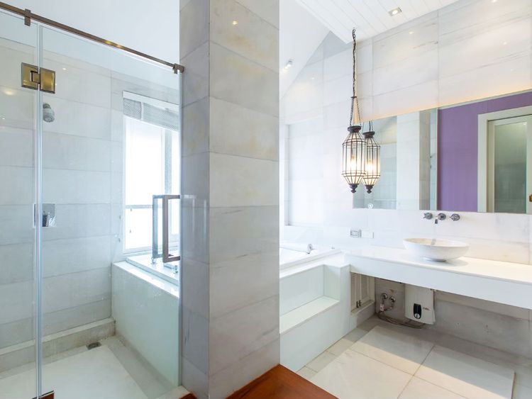>> ปูกระเบื้องหินอ่อน ติดตั้ง Shower rain แบ่งโซนแห้ง,เปียก กั้นด้วยประตูกระจก มีห้องซาวน่า และ ห้องสตรีม