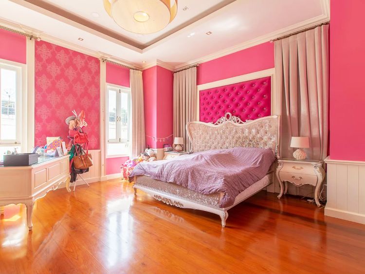 >> อยู่ชั้น2 ตกแต่งสไตล์เจ้าหญิง บุผนังหัวเตียง ตกแต่งสีชมพู พร้อมโคมไฟประดับ แยกส่วนนั่งทำงาน มีห้องน้ำในตัว ตกแต่งโทนสีขาว มีโซนอ่างจากุซซี่และโซนฝักบัว แยกโซน walk-in closet กั้นด้วยประตู