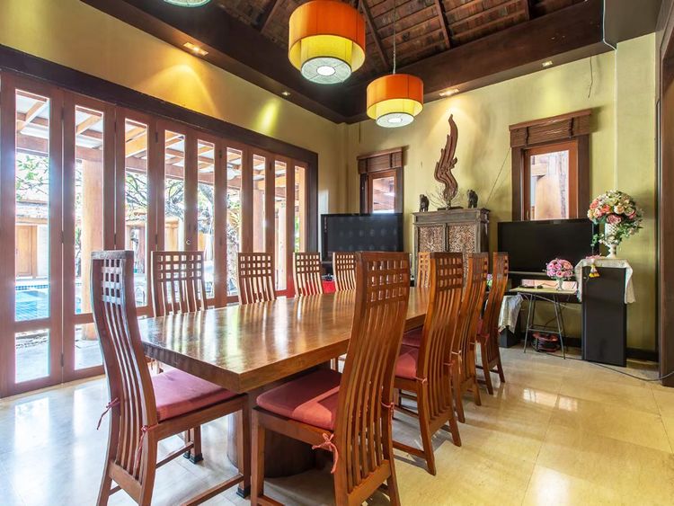 >> พื้นที่กว้าง เพดานสูง ปูพื้นหินอ่อน 60*60 cm. โต๊ะทานข้าวไม้สักหนา 3-4 นิ้ว ตกแต่งด้วยแผงไม้สัก ประดับดอกไม้สีเงิน หรูหรา