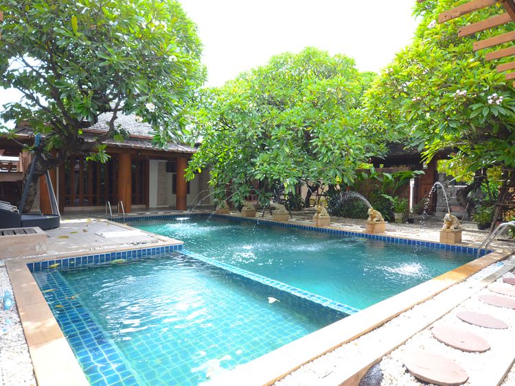 - มีสระว่ายน้ำกลางบ้าน พื้นที่รอบบ้านเยอะ มีต้นไม้ขนาดใหญ่ ให้ความรู้สึกร่มรื่น