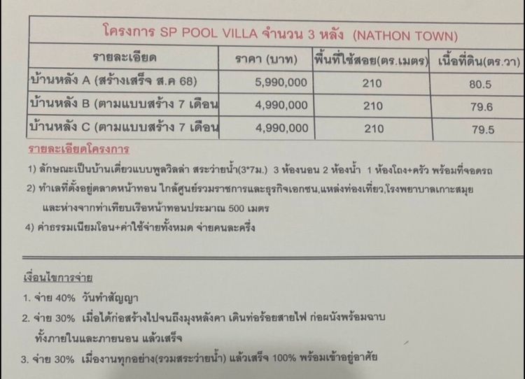 SP POOL VILLA project, 3 houses (NATHON TOWN) Details - House A (completed August 2015) Price 5,990,000 Baht Usable area 210 sq.m Land area 80.5 square wa - House B (according to the construction plan, it took 7 months) Price 4,990,000 Baht Usable area 210 sq.m Land area 79.6 square wa - House C (according to the construction plan, it took 7 months) Price 4,990,000 Baht Usable area 210 sq.m Land area 79.5 square wa