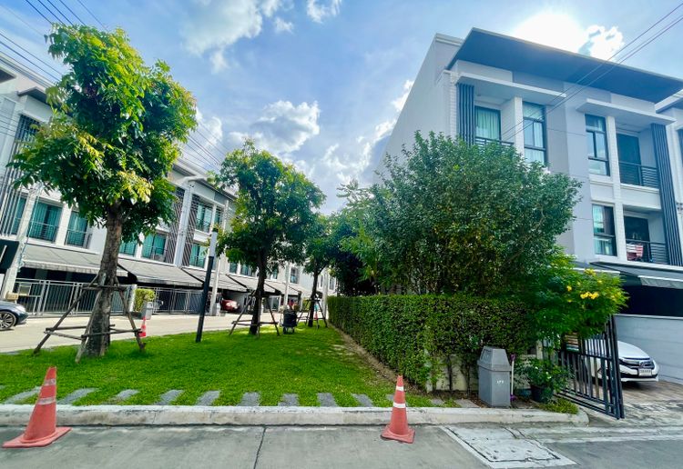ทาว์นโฮมหลังริม ทำเลดีมากๆ ติดสนามหญ้าด้านข้างและด้านหลัง มีพื้นที่สวนข้างบ้าน ด้านหลังและด้านข้างโล่ง ด้านหลังบ้านไม่ติดใคร