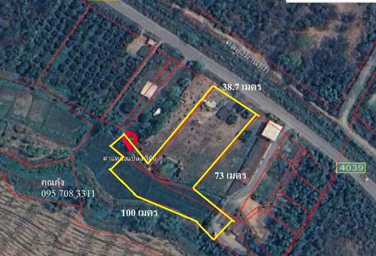 หน้ากว้าง 38.7 เมตร ลึก 100 เมตร ลักษณะที่ดินเป็นตัว T กลับหัว