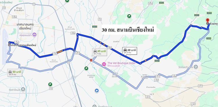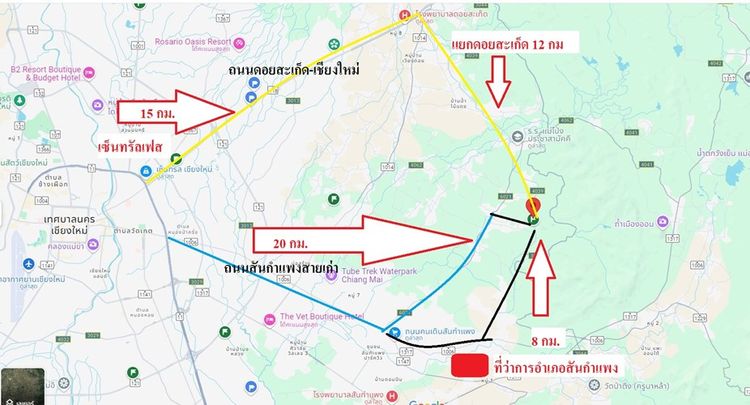 - มาจากถนน สันกำแพงสายเก่า หรือ สายใหม่ ก็ได้ค่ะ จาก ที่ว่าการอำเภอสันกำแพง 5 กม.