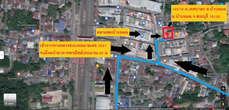 สถานที่ใกล้เคียง/ Nearby Places 1. ตลาดสดบ้านหมอ 30 เมตร 1. Ban Mor Fresh Market 30 meters 2. สถานีรถไฟบ้านหมอ 180 เมตร 2. Ban Mo Railway Station 180 meters 3. วัดบ้านหมอ 350 เมตร 3. Wat Ban Mo 350 meters 4. โรงพยาบาลบ้านหมอ 800 เมตร 4. Ban Mo Hospital 800 meters 5. หน้าอาคารติดกับถนนเทศบาล5 (ถนนลาดยาง กว้าง 5 เมตร) 5. The front of the building is adjacent to Tessaban Road 5 (asphalt road, width 5 meters). 6. ห่างจากถนนพระพุทธบาท-ท่าเรือ (3022) 1.8 กม. ห่างถนน(สบ.3021) 60 เมตร เข้าตลาดสดบ้านหมอ ติดถนนเทศบาล5 6. Away from Phra Phutthabat-Tharua Road (3022) 1.8 km., 60 meters away from the road (Sor Bor. 3021) to Ban Mo Fresh Market. Next to Tessaban Road 5 7. ห่างจากที่ว่าการอำเภอบ้านหมอ 300 ม. ห่างจากตัวจังหวัดสระบุรี 28 กม. 7. Away from Ban Mo District Office 300 meters, away from Saraburi 28 km. 8. อาคารสร้างมาแล้ว 25 ปี 8. The building has been built for 25 years.