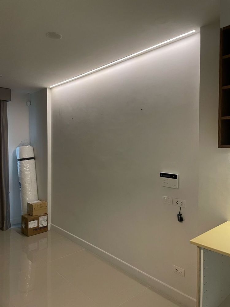 • เพิ่มหลอดไฟโทนสีอบอุ่นตามขอบเพดาน + โคมไฟตรงโต๊ะทานข้าว