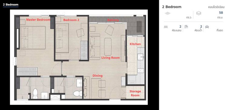 ห้องแบบ 2 ห้องนอน 2 ห้องน้ำ