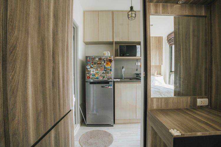 ซ่อนไฟ LED ที่หัวเตียง ประตูบานเลื่อน กั้นห้องนอนกับห้องครัว ส่วนครัวพร้อมที่ดูดควัน โต๊ะอเนกประสงค์พับได้ในห้องครัว