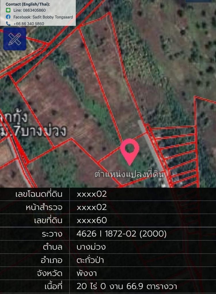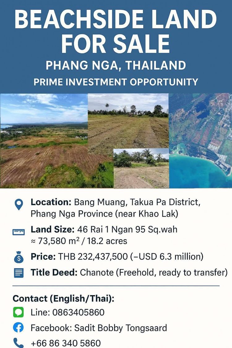 📍 Location: Bang Muang, Takua Pa District, Phang Nga, Thailand 📏 Total Area: 46 Rai, 1 Ngan, 95 Sq.wah (≈73,580 m²) 💰 Price: THB 232,437,500 (5 million Baht per Rai)