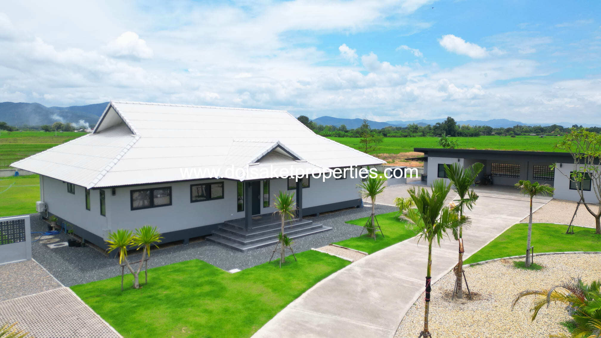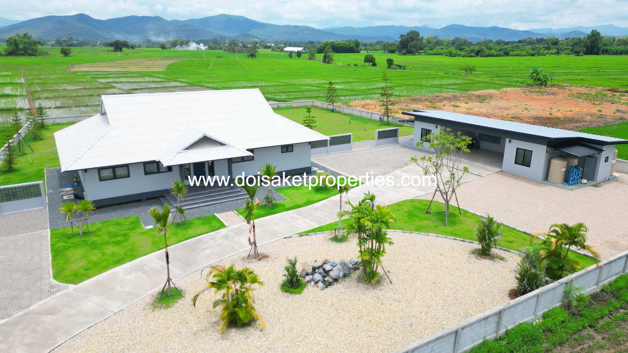 (HS363-04) Beautiful 4-Bedroom Modern Home with Great Mountain Views for Sale in Pa Pong, Doi SaketPrice: 8,500,000 Baht (tax and transfer fee 50/50)Land Size: 2 Rai 58 Sq.w. (858 Sq.w./3,432m2)Living Area: 316 m2CLICK HERE TO WATCH A VIDEO TOURDoi Saket Properties is happy to offer for sale this lovely home set on 2+ rai of land in a quiet spot in Pa Pong, Doi Saket. It features wonderful 360-degree mountain views and is perfect for those looking for a country life with easy access to the city. The 200+ sqm main house has 3 bedrooms, 2 bathrooms, a large open-plan kitchen, living, dining area and a large terrace. The 110 sqm guest house / garage has a bedroom, 2 bathrooms, laundry room, storeroom and parking for three cars. The property was built with quality in mind and has double walls, extensive garden watering system, CCTV security, amongst many other features. It is in a great location just: - 3 km from Doi Saket-Bo Sang road (1014) - 5 km from Chiang Mai-Chiang Rai road (Route 118) - 20 km from Central Festival Chiang Mai - 28 km from Chiang Mai International Airport (HS363-04) ขายบ้านสวยทันสมัย 4 ห้องนอนพร้อมวิวภูเขาที่สวยงามใน ป่าป้อง ดอยสะเก็ดราคา : 8,500,000.- บาท (ค่าธรรมเนียมการโอนกรรมสิทธิ์ 50/50)เนื้อที่ : 2 ไร่ 58 ตารางวา (858 ตารางวา/3,432 ตารางเมตร)พื้นที่ใช้สอย : 316 ตารางเมตรดอยสะเก็ดพร็อพเพอร์ตี้มีความยินดีที่จะเสนอขายบ้านบนที่ดิน 2 ไร่กว่าในทำเลที่เงียบสงบในป่าป้อง ดอยสะเก็ด มีวิวภูเขา 360 องศา เหมาะสำหรับผู้ที่มองหาชีวิตในชนบทที่เข้าถึงเมืองได้ง่าย บ้านหลักขนาด 200+ ตร.ม. มี 3 ห้องนอน 2 ห้องน้ำ ห้องครัวแบบเปิดโล่งขนาดใหญ่ พื้นที่นั่งเล่น พื้นที่รับประทานอาหาร และระเบียงขนาดใหญ่ เกสต์เฮาส์/โรงจอดรถขนาด 110 ตร.ม. 1 ห้องนอน 2 ห้องน้ำ ห้องซักรีด ห้องเก็บของ และที่จอดรถ 3 คัน ที่พักแห่งนี้สร้างขึ้นโดยคำนึงถึงคุณภาพและมีผนัง 2 ชั้น ระบบรดน้ำสวนที่กว้างขวาง ระบบรักษาความปลอดภัยด้วยกล้องวงจรปิด และคุณสมบัติอื่นๆ อีกมากมาย ตั้งอยู่ในทำเลที่ดีเพียง: - 5 กิโลเมตร จากถนนหมายเลข 1014 ดอยสะเก็ด-บ่อสร้าง - 5 กิโลเมตร จากถนนหมายเลข 118 เชียงใหม่-เชียงราย - 20 กิโลเมตร จากเซ็นทรัลเฟสติวัลเชียงใหม่ - 28 กิโลเมตร จากสนามบินนานาชาติเชียงใหม่ , ...