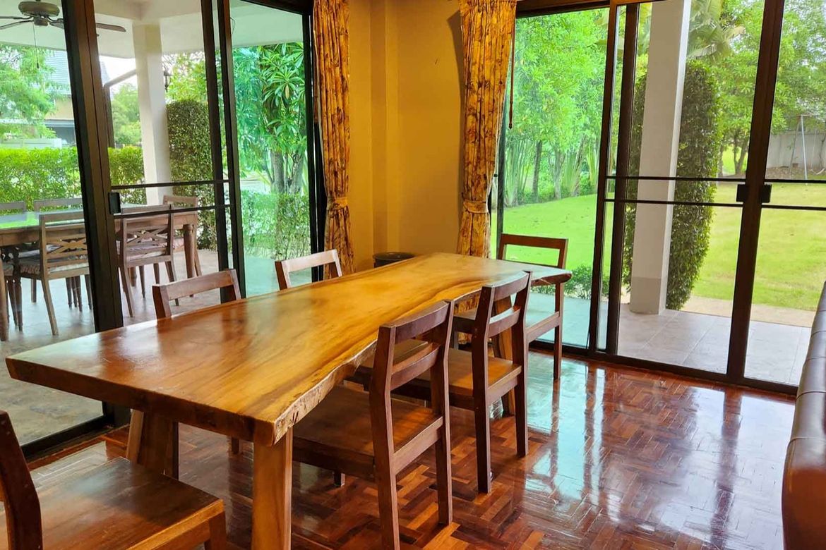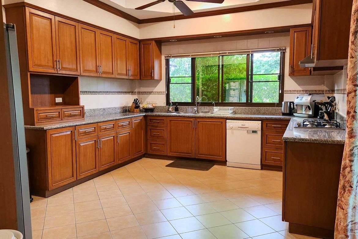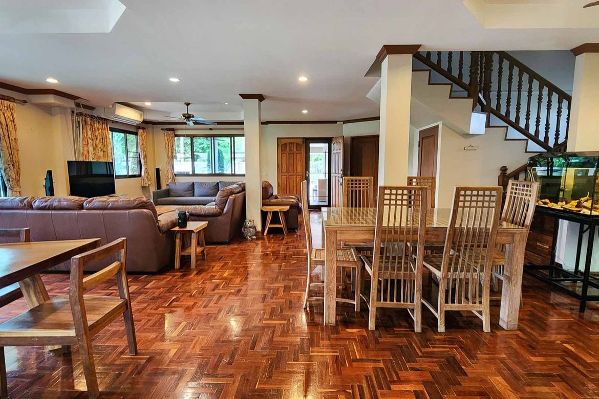 5 Bedroom House for Sale or Rent in Pa Pong, Chiang MaiThis oasis is situated in an older but well-maintained and landscaped housing village where there are quite a few vacant lots making it feel open and spacious. The house is on a quiet shaded lane lined with large mature trees. There are empty plots on the front and adjacent sides, as well as a wide scenic canal in the rear. The massive open garden provides further seclusion and peace. Manicured hedges front, and when you walk through the front gate of this pool villa you feel like you’ve come to a resort getaway. The pool’s blue-green tile and flowing water are calming and inviting. Plumeria and large fan trees inside of the property and offer tranquillity any time of the day. The 360 walkway and wrap-around terrace have excellent landscaping with hedges and planters accompanying them. With automatic soft warm garden lights at night, the atmosphere remains inviting and welcoming even at night.Outside Highlights:Private natural swimming pool (5.6 x 4.5m plus stairs with a depth from 1-1.85 m. A separate elevated jacuzzi sitting area 2.1 x 2.1 m. with a depth of 1 m. that overflows into the main pool as a waterfall feature). This pool uses copper ionization and only minor amounts of chlorine (vs traditional saltchlorine systems which have much higher chlorine levels) leaving your skin feeling soft instead of dried out.Spacious deck next to the pool for lounging or entertaining with table and chairs set including an overhanging umbrella.Separate fenced-in area which could be used for elevated vegetable beds if one so desired.Sprinkler system with a separate pump that pumps water from the canal on a timer.Outdoor soft warm lights on a timerOutdoor kitchen-dining area with oven and stove range, sink, cabinets and countertop.Large covered terrace with dining table overlooking the canal and garden area.Wrap around terrace with a wide roof overhang.Front terrace sitting area with coffee tabledrawers for storing pool towels.Covered 2 car park with remote controlled inner garage door for added security and privacy. Additional parking also available on the street.The canal at the rear is more like a peaceful pond as it is in sections and flows more during rainy season. Lots of fish and you may even want to try some catch and release from the steps leading down.Enjoy shootings some hoops out on the quite road in front of the house where the outdoor basketball hoop sits.Interior Highlights:The interior of house has a open yet warm and welcoming feel. With all the windows you get a nice cross breeze or close it up and turn on the AC depending on your preference.Large floor-to-ceiling windowsdoors with screens in the open floor plan dining arealiving areaWindows have a sun-reflective sheen.Parquet wooden floorsAll lights are soft warm white color5 bedrooms (master bedroom downstairs and 4 bedrooms upstairs)2 12 bathrooms (1 shower in the master bedroom and 1 upstairs. Downstairs toilet off the laundry room)Hot water at every indoor tap including showers, bathroom sinks, kitchen sinks and laundry room.Built-in closets and drawers in every bedroomBuilt-in deep storage cabinets in the office area, kitchen, and laundry room.Additional storage areas: Under-stairs room, 2nd-floor large walk-in attic, outdoor storage room with shelves, gardening supplies area by garagefront entrance.Large indoor western kitchen with built-in cabinets, granite countertops, 4-burner stove range and hood.Laundry room off the kitchen with stacked washerdryer, foldable wooden wall shelf, deep utility sink and cabinet underneathMultiple wall hooks ready to hang your favourite paintings or picturesPlant pots and stands ready for your green thumbs. ...