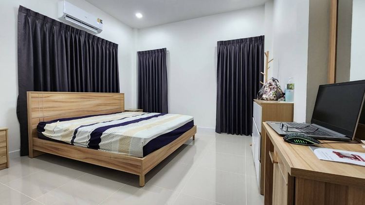 This fully furnished house was only newly furnished 16 months ago. Equipped with 3 Air-conditioners, 2 washing machines, flat screen TV, a large refridgerator and nice curtains. Safety window bars and mosquito screens were recently installed. Complete kitchen, including coffeemaker, microwave, gas stove and all cooking equipment such as pans, pots, porcelain and cuttlery.Just recieve the keys and you are able to sleep in this nice and modern house at the same day.Every thing is in a very good condition.There is a king size bed in the master bedroom and a queen size bed in the second bedroom. The third bedroom has been used as storeroom and has several shelves. Your new home is located near WHA Rayong Industrial Land (WHA RIL), in a qiet neighborhood.