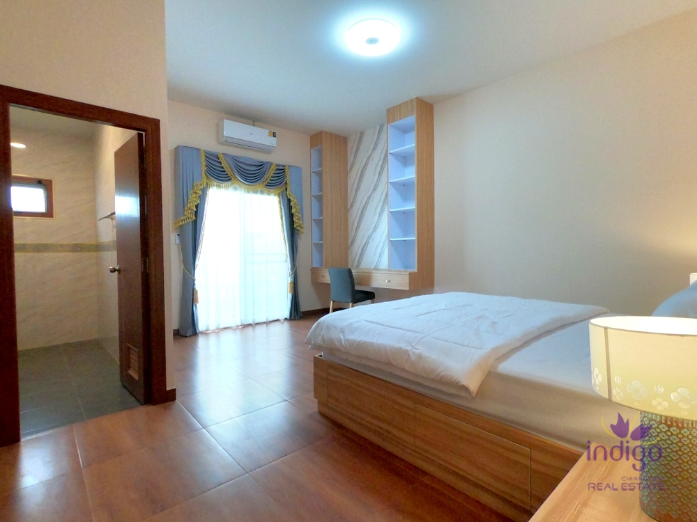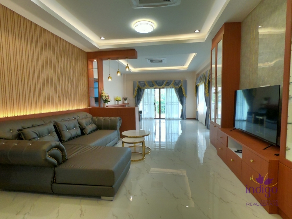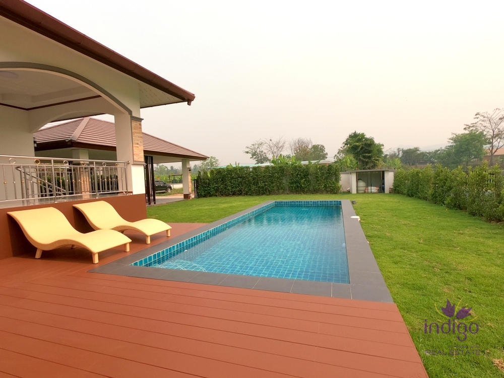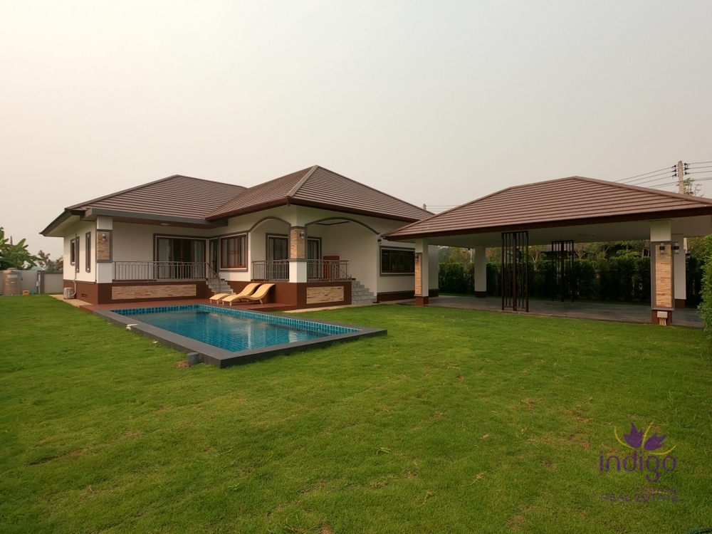 Brand new single storey house for sale in a small neighbourhood in Doi Saket countryside. The house is on a large 188 wah (752 sqm) plot of land and has lovely mountain and rice field view. There is also a private 3x9m salt water swimming pool with a great pool deck - ideal for relaxing outside. Features:- Large single storey house with total built area of 327 sqm- Spacious open plan living area with custom built in cabinets and plenty of storage- Large eat in western style kitchen with dining area, bar area. There is also an oven. - Spacious bedrooms, most with ensuite bathrooms.- Large covered patio with garden and mountain view - an ideal place for relaxation! The lovely home would be perfect if you"re looking for a home close to local shops and markets and only about 25-30 min drive to Central Festival. - Near Doi Saket shops and market, Doi Saket Temple and Mae Kuang Dam. Free!- 7 air-conditoners- 4 hot water heaters- Furniture and appliances Please contact us for more information or to view! ...
