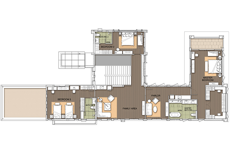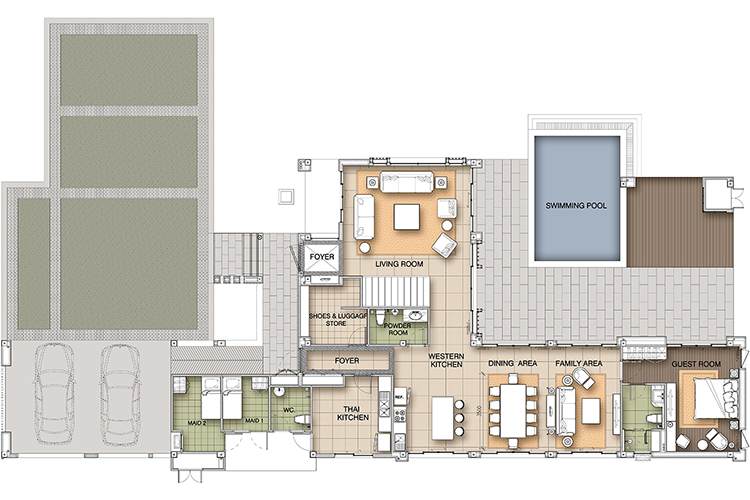 * โดดเด่นด้วยการออกแบบที่เน้นความโล่งโปร่งสบายเพื่อให้เหมาะกับสภาพอากาศของไทย ด้วยการใช้เพดานสูง หน้าต่างและประตูบานใหญ่ จึงเปิดรับอากาศบริสุทธิ์ สายลมและธรรมชาติเขียวสดงดงามซึ่งหาได้