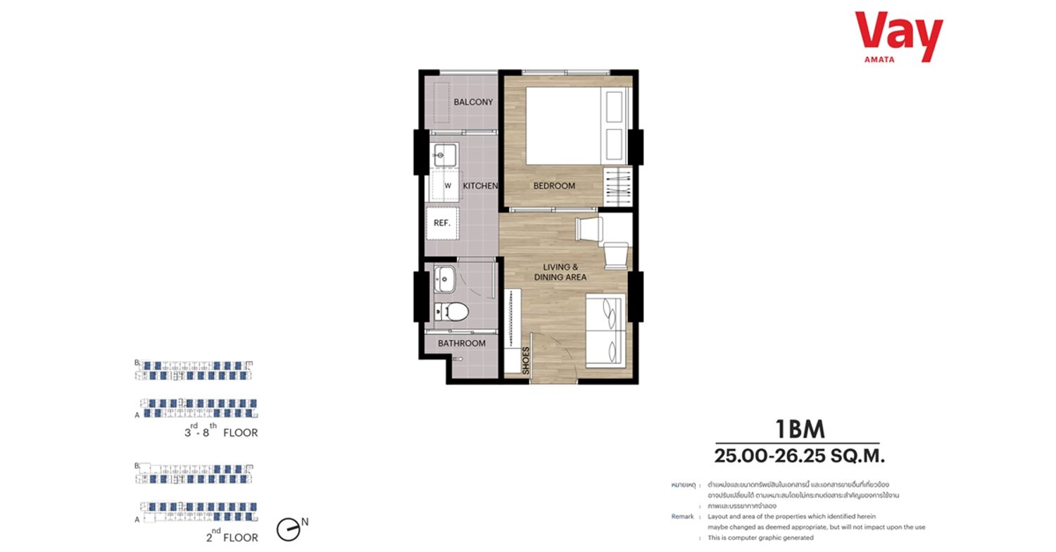 * 1 Bedroom (M) ขนาด 25-26.25 ตร.ม.